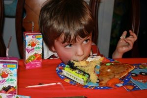 Clearly, he was scheming on dessert, because soon enough, the other kids had scarfed their meals and were ready for cake. Onto his plate, he spat a wad of chewed carrot, and proceeded to eat a piece of cake the size of his head. About that time, they handed out popsicles too. You should have heard the maniacal laugh that burst forth from that child, as he grasped a popsicle in one hand and leaned forward to bury his teeth in the cake before him. In the picture below, you can’t see the popsicle, but you might notice the complete absence of silverware and social grace.