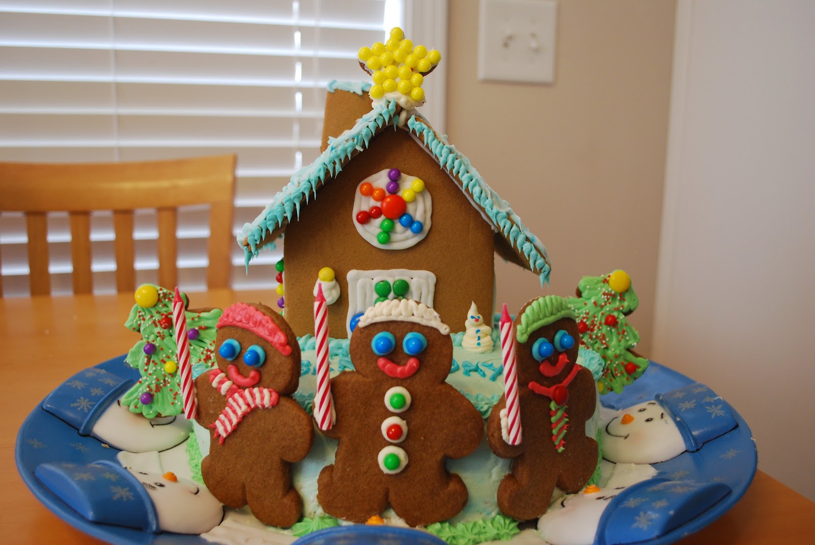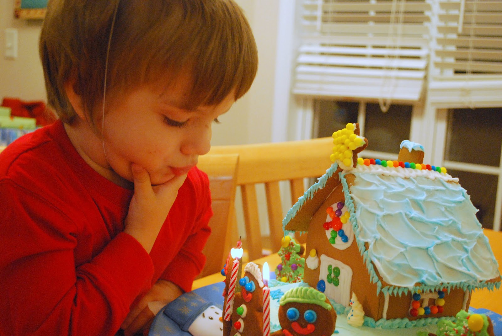 He finally got to dig into his “snowy house” cake that he’d been drooling over for days. Notice how he helps his lips to blow out the candles.