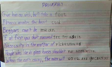 Today we had fun learning some proverbs and idioms, which seem to be nearly the same, except that proverbs are longer. I wrote the beginning of some common sayings and let them think about how to finish them. They came pretty close with a bunch of them. I made sure they didn’t discuss their answers or look at each other’s papers. Of course, at the end, we discussed the real endings and what they mean, and how they tend to make sense only inside our own culture.